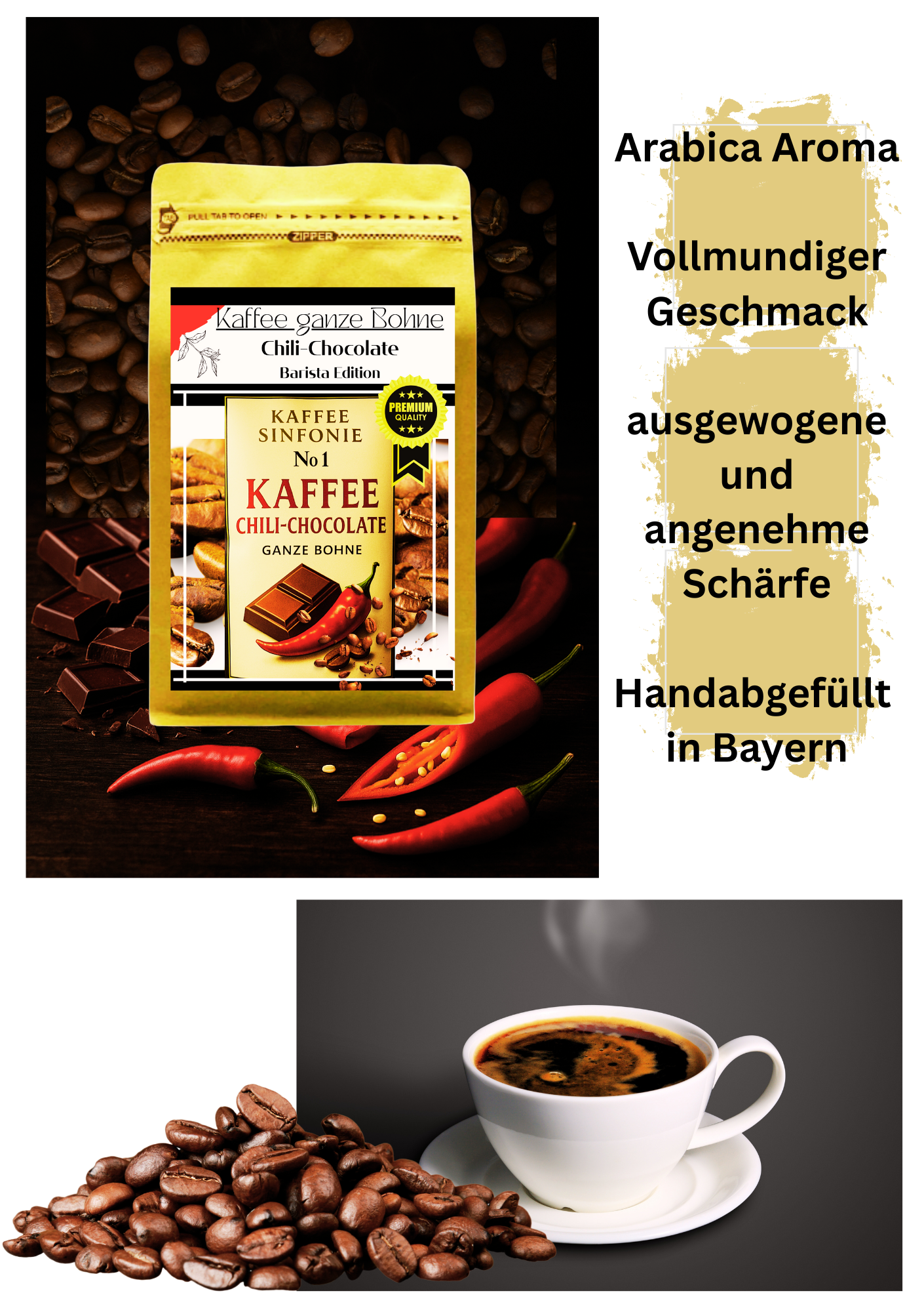 Bereite dich auf eine aufregende Geschmacksreise vor! Unser Chili-Chocolate Kaffee, auch bekannt als "Azteken Feuer", definiert den Begriff "Hot Chocolate" neu. Hier dominiert das volle, kräftige Aroma dunkler Schokolade den ersten Eindruck, gefolgt von einer ausgewogenen und angenehmen Schärfe, die auf der Zunge tanzt. Die natürliche Süße der sorgsam gerösteten Kaffeebohnen rundet dieses feurige Erlebnis ab. Inspiriert von den Azteken, die die belebende Wirkung von Chili in Verbindung mit Schokolade schätzten, ist dieser Kaffee ein absolutes Highlight für jeden, der es etwas "schärfer" und außergewöhnlicher mag.