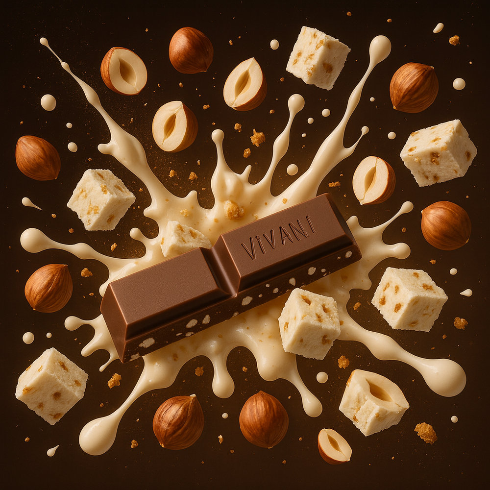 Zarte weiße Schokolade auf Reisdrink-Basis und knuspriges Haselnusskrokant
