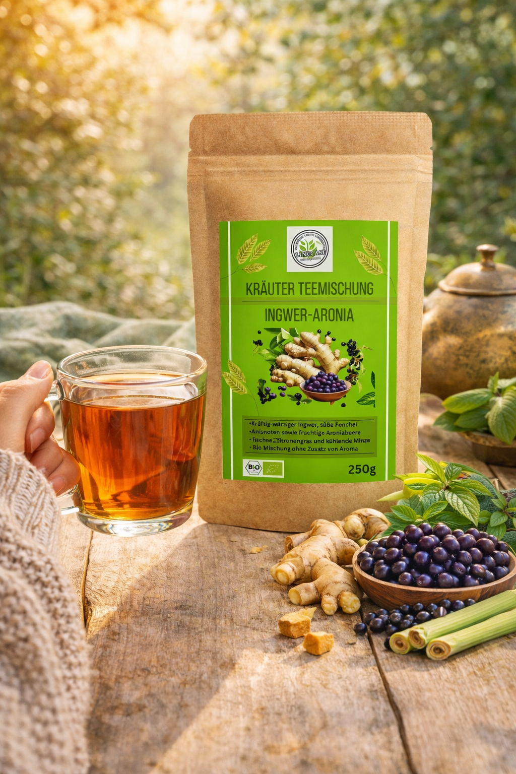 Fruchtige Note: Die Aroniabeere verleiht dem Tee eine besondere Tiefe und einen fruchtig-herben Akzent, der wunderbar mit der Schärfe des Ingwers harmoniert.
